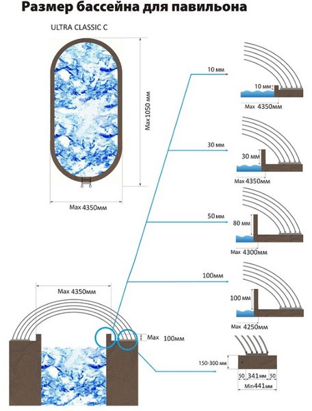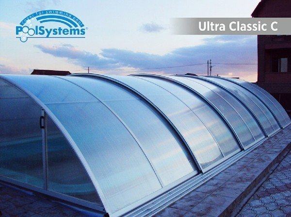 Павильоны Ультра Классик являются наиболее компактным и экономичным вариантом накрытия. Из всех предлагаемых типов павильонов его сводчатая форма конструкции является наиболее устойчивой к воздействию климатических условий. Имея арочную форму, этот раздвижной павильон для бассейна аккуратно впишется в архитектуру любого ландшафта.. Рекомендуется выбирать длину покрытия для бассейна больше, чем длина бассейна на 0,5 - 1 метр. При ширине павильона данного типа более пяти метров появляется возможность входить в него, не наклоняясь.